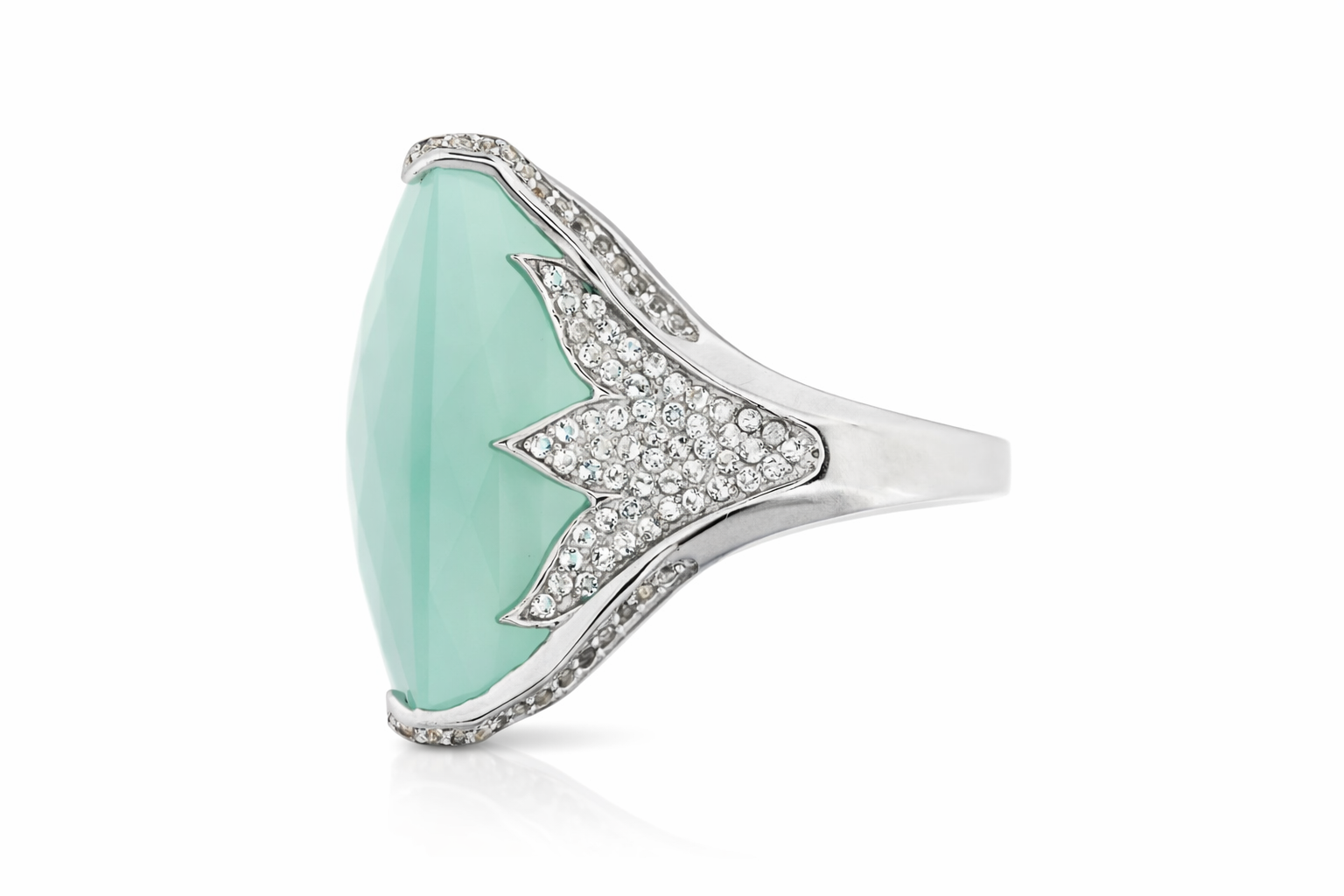 This 925 Aqua Chalcedony and White Topaz Ring blends natural beauty with refined craftsmanship, making it a timeless addition to any modern jewelry collection.