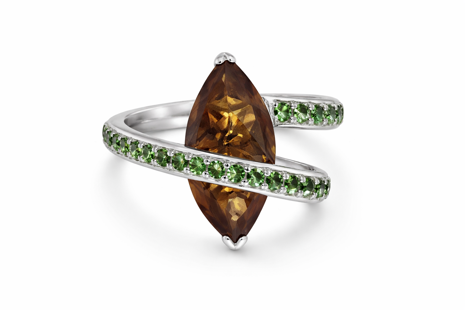 This Cognac Quartz and Chrome Diopside Ring blends rich tones with modern elegance, making it a versatile and timeless addition to any jewelry collection.
