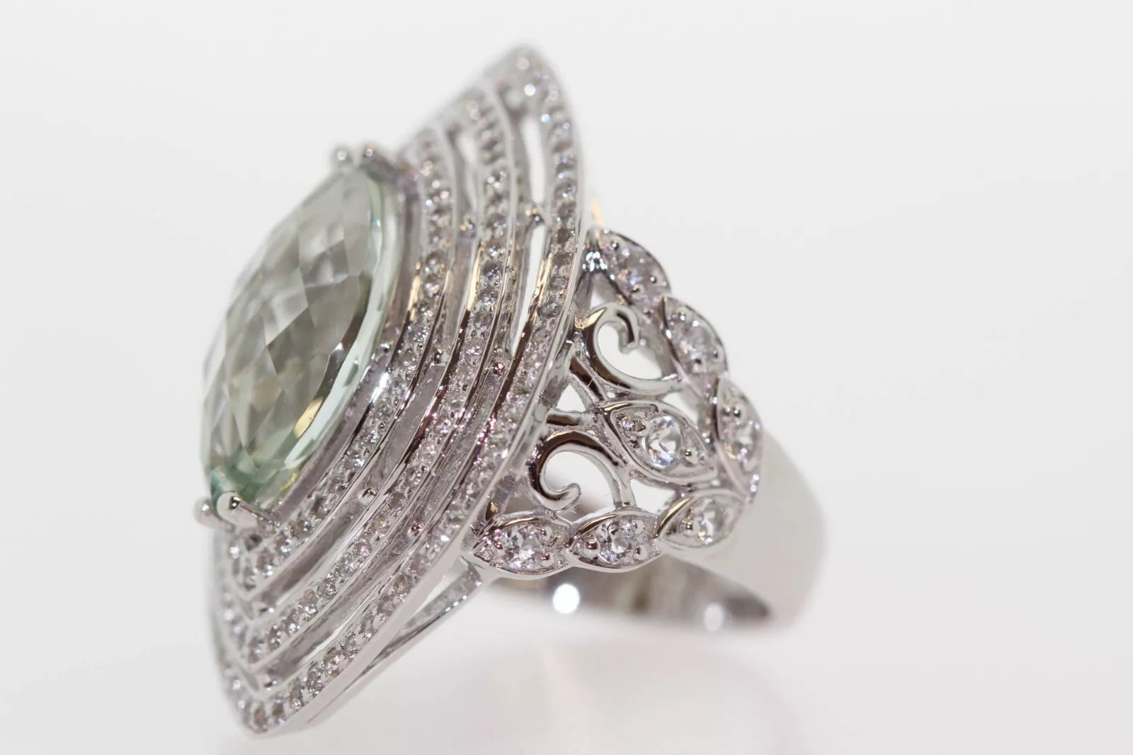 .925 Sterling Silver / Green Amethyst / White Topaz Ring .