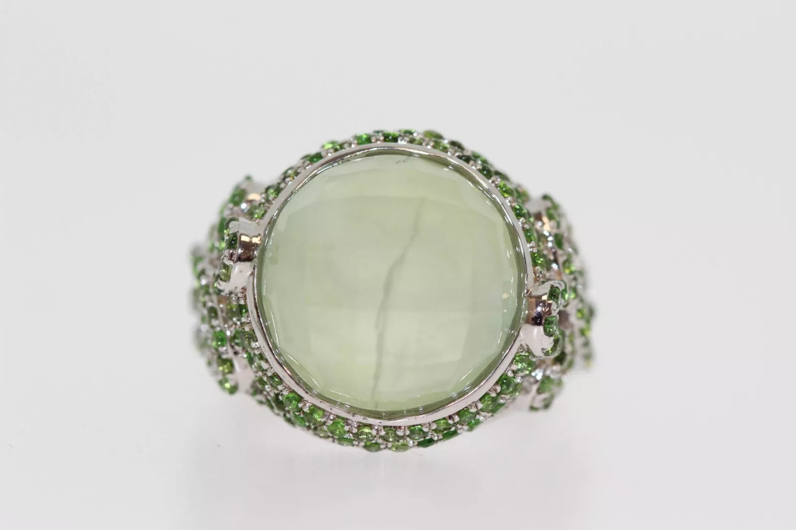 Whether worn alone as a statement piece or styled with minimalist accessories, this prehnite and chrome diopside ring delivers elegance, color, and enduring charm.