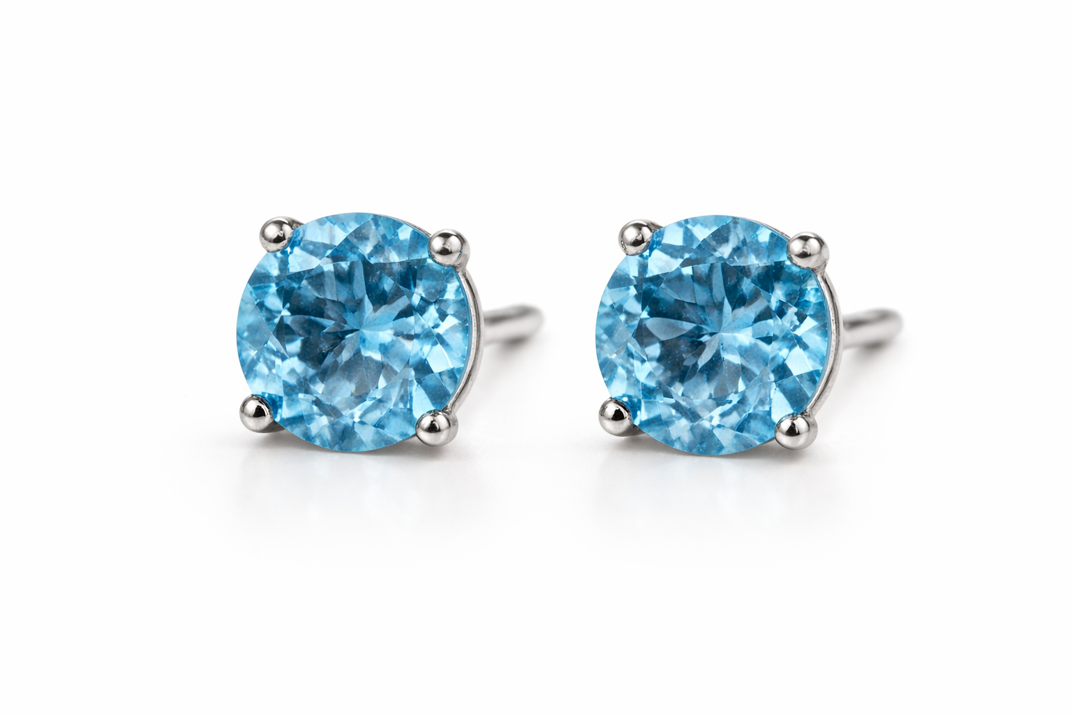 ELEGANT 14K AQUAMARINE ROUND STUD EARRING 8MM, 3DOT41 CTS